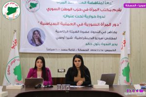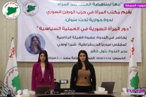 أطلق مكتب المرأة في حزب الوطن السوري ندوة حوارية بعنوان “المرأة والسياسة” في قاعة مجلس سوريا الديمقراطية، بحضور ومشاركة واسعة شملت ستين شخصية نسائية من مختلف مناطق الجزيرة. تأتي هذه الفعالية ضمن حملة موسعة لمناهضة العنف ضد المرأة، وتهدف إلى تعزيز حضورها ودورها في المجال السياسي والاجتماعي.