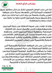 وإننا إذ نشدد على ضرورة الحفاظ على حياة المدنيين وتجنيبهم ويلات الحرب والدمار، نحمل كل الاطراف المتحاربة مسؤولية حماية المدنيين العزل. ونحثهم على عدم العودة مجددا إلى المربع الأول القائم على العنف والحرب والقتل والتشريد وتنفيذ المخططات الدولية والاقليمية على حساب السوريين أنفسهم.