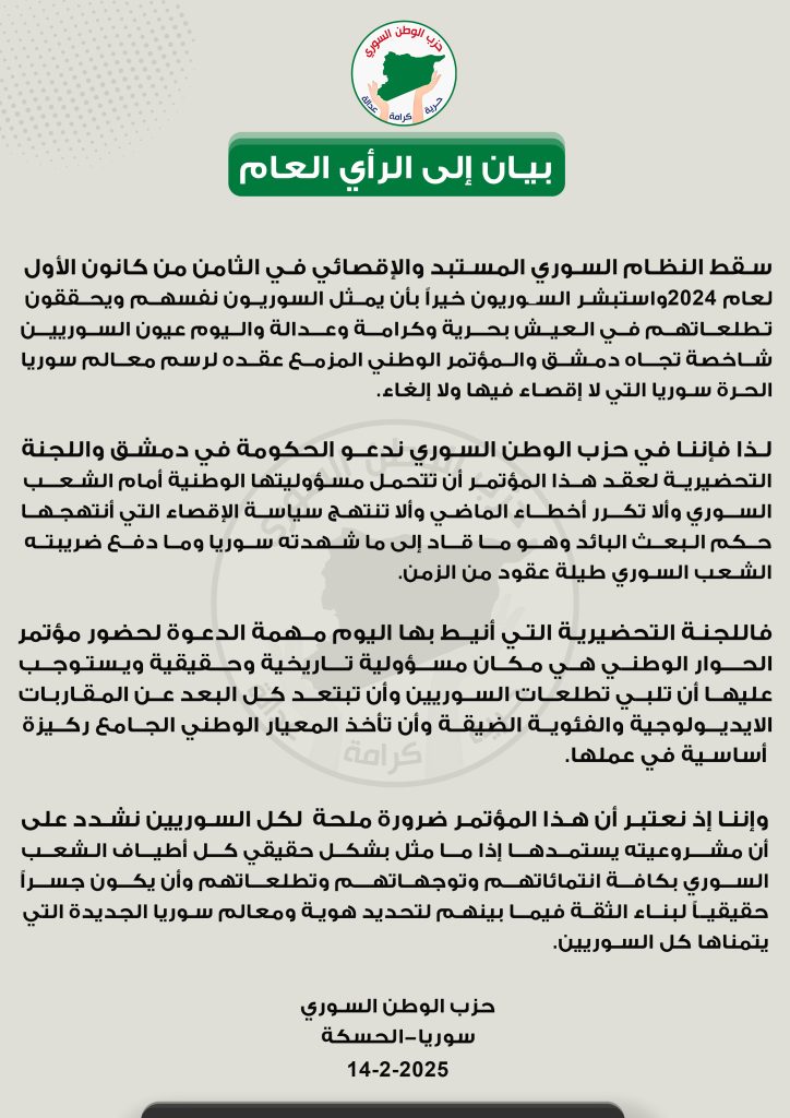 لذا فإننا في حزب الوطن السوري ندعو الحكومة في دمشق واللجنة التحضيرية لعقد هذا المؤتمر أن تتحمل مسؤوليتها الوطنية أمام الشعب السوري وألا تكرر أخطاء الماضي وألا تنتهج سياسة الإقصاء التي أنتهجها حكم البعث البائد وهو ما قاد إلى ما شهدته سوريا وما دفع ضريبته الشعب السوري طيلة عقود من الزمن.