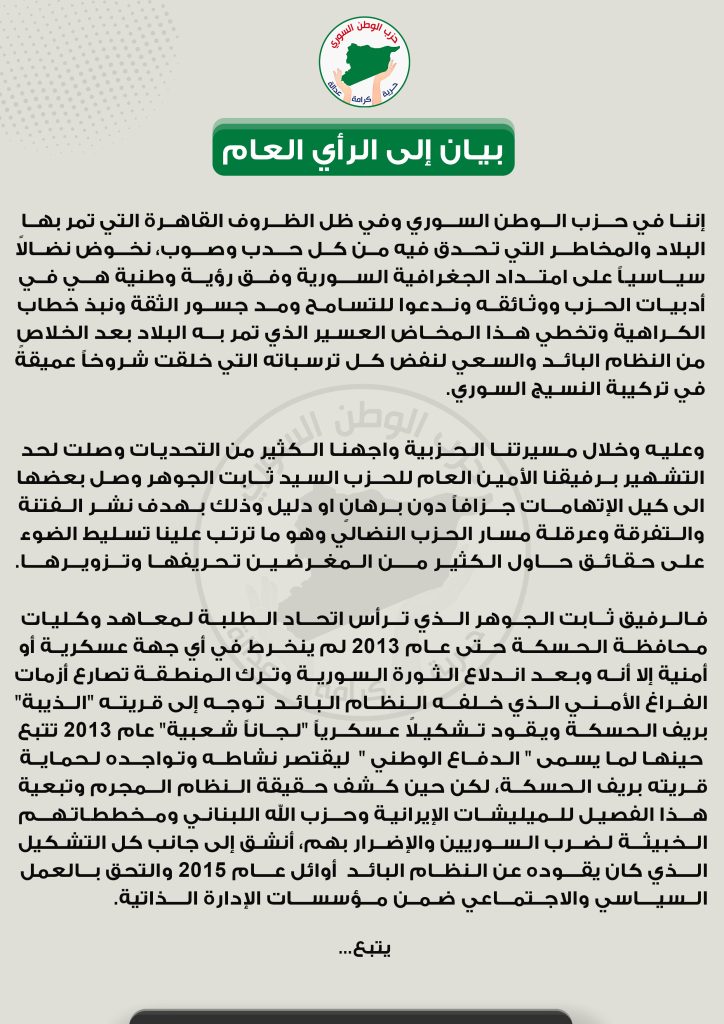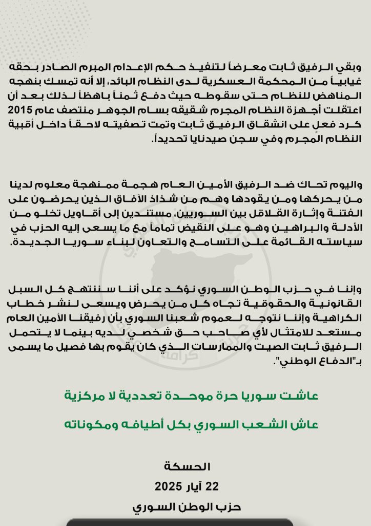 واليوم تحاك ضد الرفيق الأمين العام هجمة ممنهجة معلوم لدينا من يحركها ومن يقودها وهم من شذاذ الآفاق الذين يحرضون على الفتنة وإثارة القلاقل بين السوريين، مستندين إلى أقاويل تخلو من الأدلة والبراهين وهو على النقيض تماماً مع ما يسعى إليه الحزب في سياسته القائمة على التسامح والتعاون لبناء سوريا الجديدة.