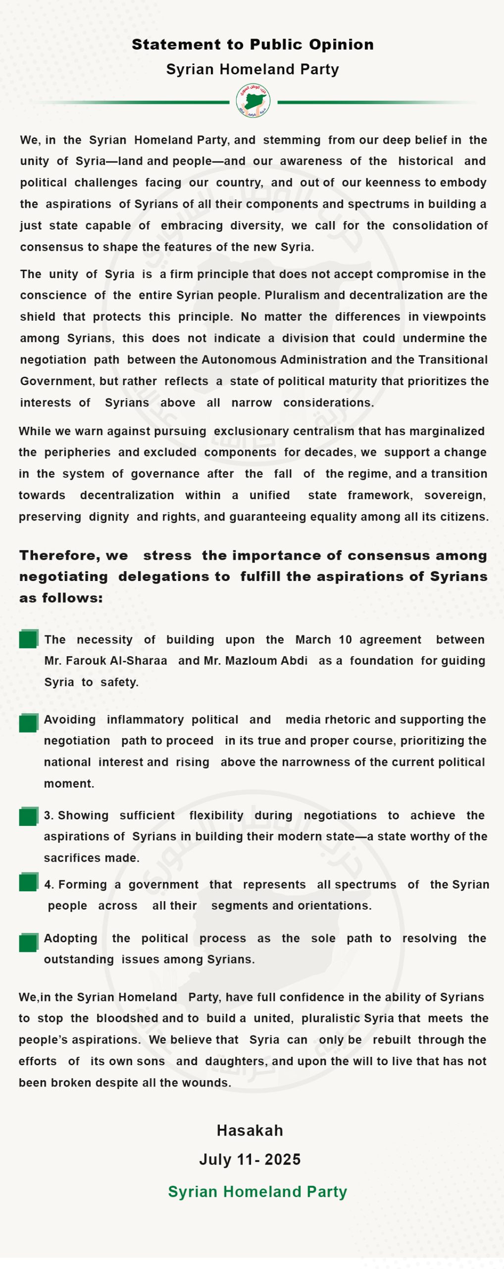 We, in the Syrian Homeland Party, and stemming from our deep belief in the unity of Syria—land and people—and our awareness of the historical and political challenges facing our country, and out of our keenness to embody the aspirations of Syrians of all their components and spectrums in building a just state capable of embracing diversity, we call for the consolidation of consensus to shape the features of the new Syria.