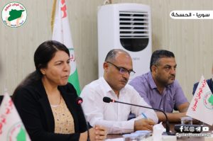 نظم اليوم حزب الوطن السوري ندوة حوارية في قاعة مسد بالحسكة حاضر في هذه الندوة الرئيسة المشتركة لمجلس سوريا الديمقراطية السيدة ليلى قرمان وأدار الندوة عضو المكتب السياسي الرفيق خضر دهام و بحضور أعضاء الحزب على كافة المستويات الحزبية.