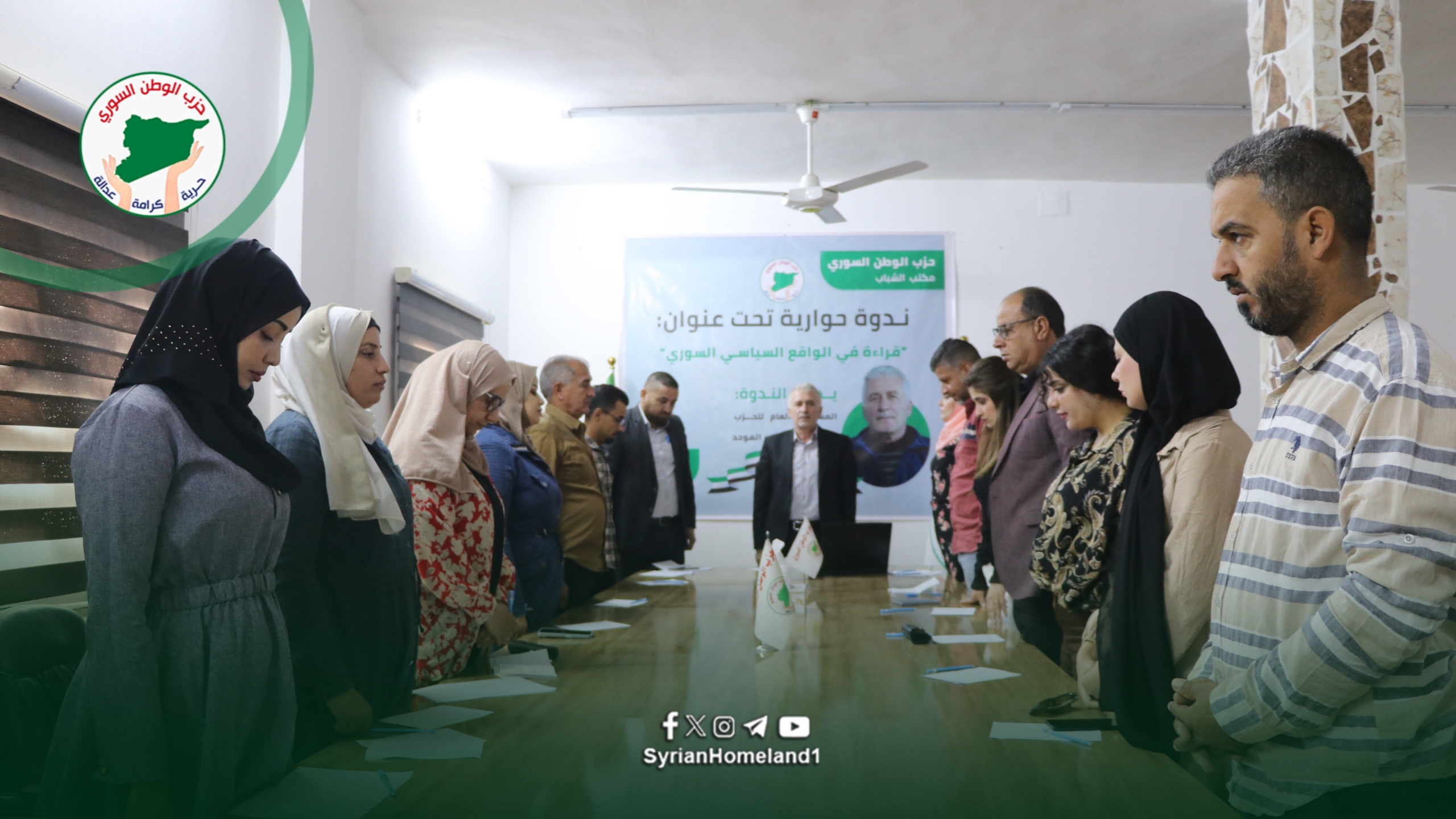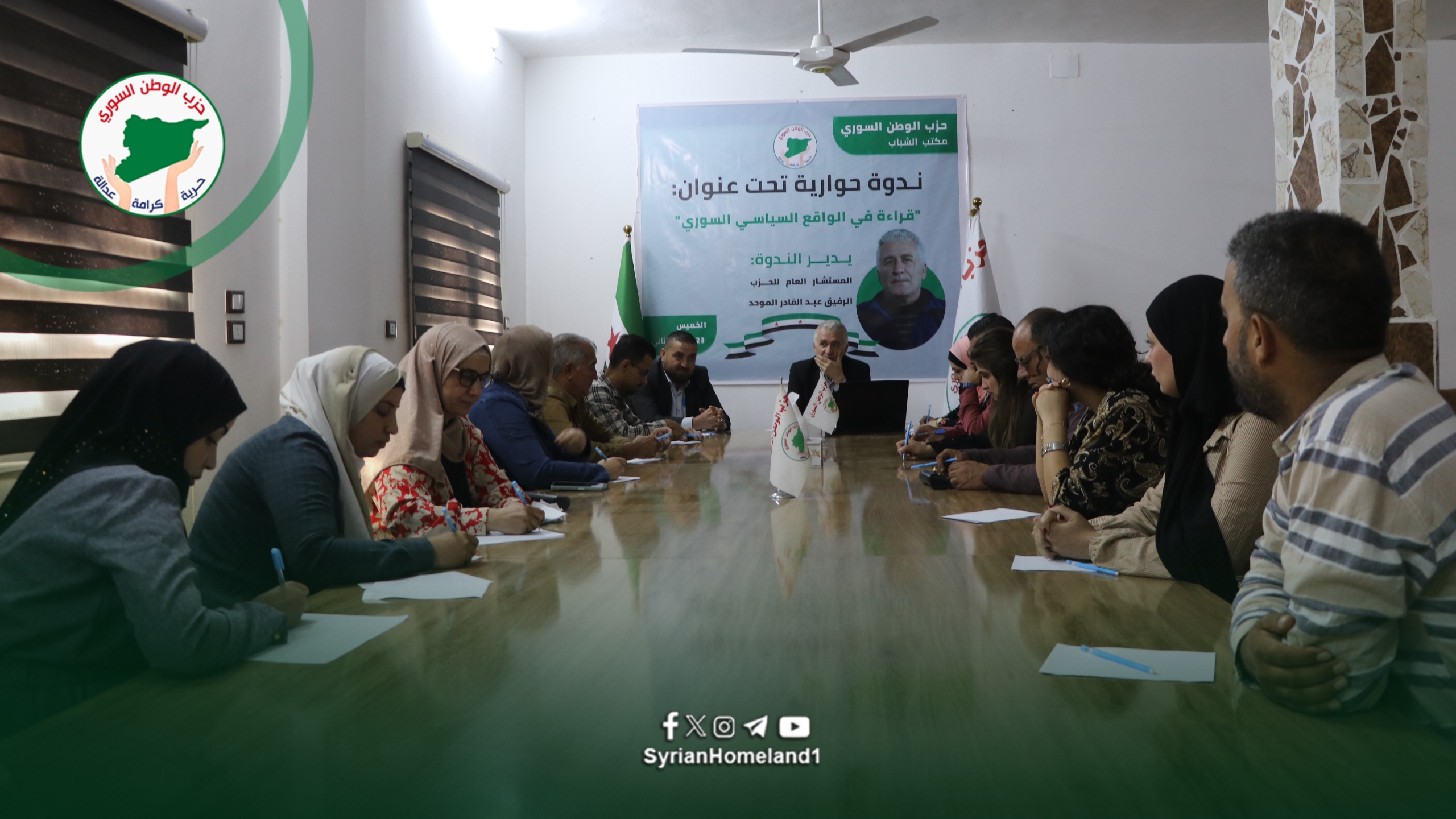 نظّم مكتب الشباب في حزب الوطن السوري ندوة حوارية بعنوان “قراءة في الواقع السياسي السوري”، يُحاضر فيها المستشار العام للحزب الرفيق عبد القادر موحد.