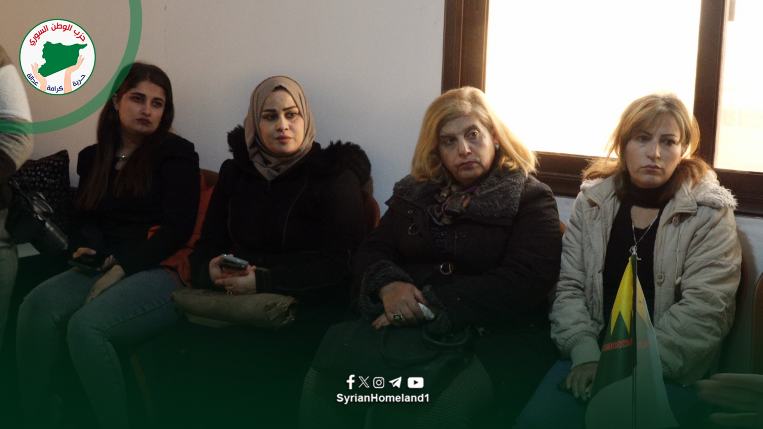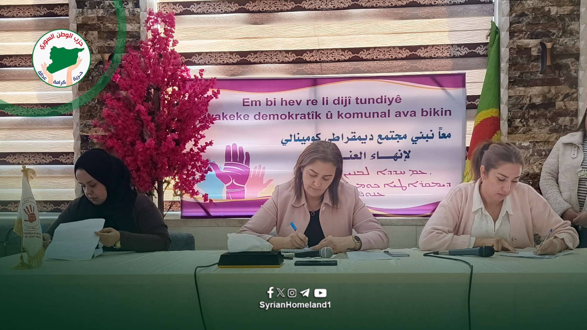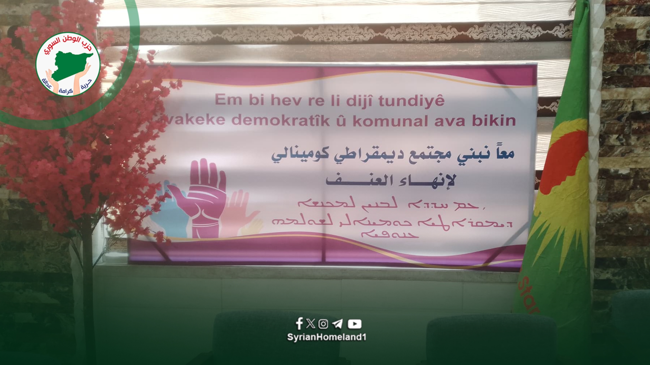 “معاً نبني مجتمعاً ديمقراطياً كومينالياً لإنهاء العنف”، شارك وفد من حزب الوطن السوري ترأّسته رئيسة مكتب المرأة الرفيقة راية عليوي، حيث تناولت المداخلات تعريف العنف ضد المرأة وأنواعه وأسبابه وآثاره النّفسيّة والاجتماعية، إضافة إلى أهميّة تطبيق القوانين والعقوبات الرادعة بحق مرتكبي الجرائم بما يسهم في حماية النساء وصون كرامتهن