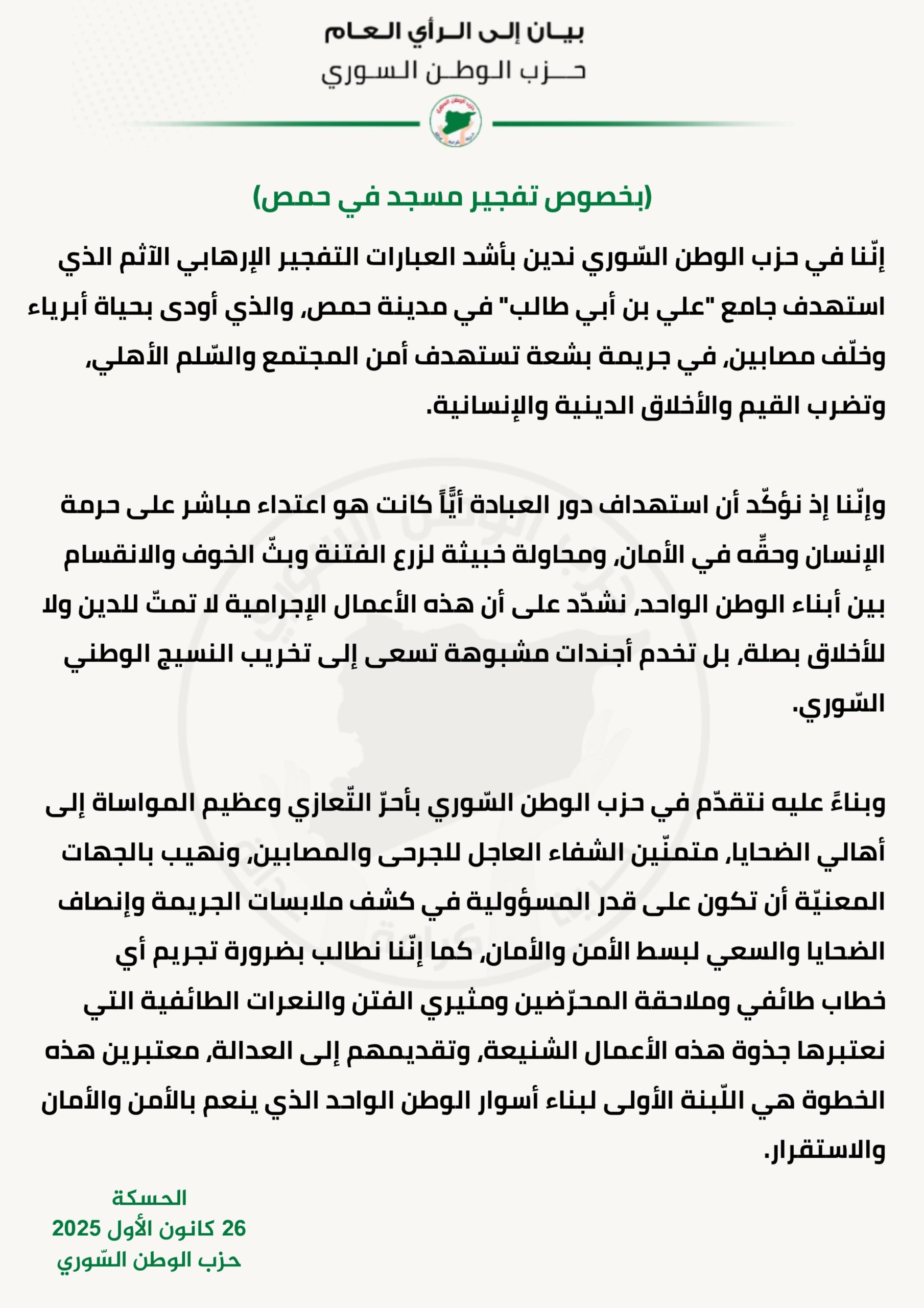 إنّنا في حزب الوطن السّوري ندين بأشد العبارات التفجير الإرهابي الآثم الذي استهدف جامع “علي بن أبي طالب” في مدينة حمص، والذي أودى بحياة أبرياء وخلّف مصابين، في جريمة بشعة تستهدف أمن المجتمع والسّلم الأهلي، وتضرب القيم والأخلاق الدينية والإنسانية.